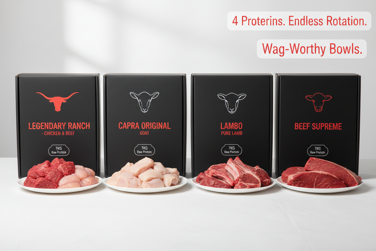 Meet the pasture-to-bowl party pack for serious chompers and fussy foodies alike. The Quad Squad dishes 28kg of clean, drool-worthy raw: 7kg Beef Supreme, 7kg Capra Organic Goat, 7kg Lambo Pure Lamb, and 7kg Legendary Ranch Chicken & Beef. Each 7kg box comes pre-portioned as 38 x ±200g patties—just thaw, serve, and watch the tails go turbo.